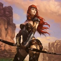 The image features a female character with red hair and armor, standing in a rocky landscape that appears to be set at sunrise or sunset given the warm hues in the sky. She is holding a bow and arrows, suggesting she might be an archer or warrior from a fantasy setting. The overall impression is of a strong, confident character prepared for action.