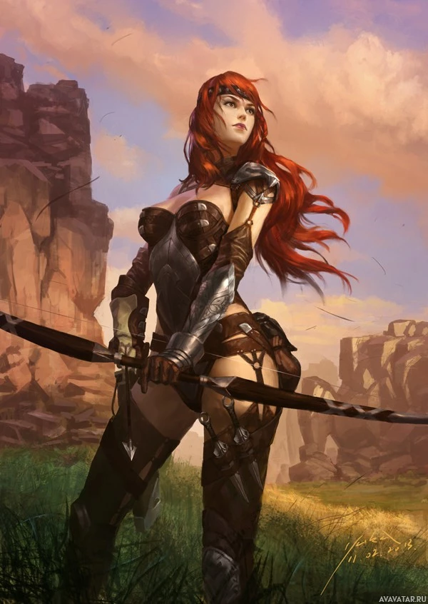На картинке изображен женский персонаж с рыжими волосами и доспехами, стоящий в скалистом ландшафте, который, кажется, устанавливается на восходе или закате солнца, учитывая теплые оттенки в небе. Она держит лук и стрелы, предполагая, что она может быть лучником или воином из фантастической обстановки. Общее впечатление — сильный, уверенный в себе характер, готовый к действию.