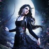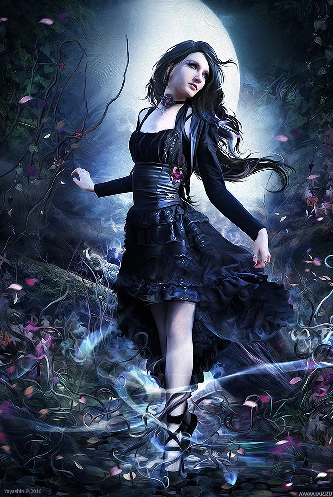 brunette girl standing in what appears to be an enchanted forest or fantasy setting at night. She is wearing