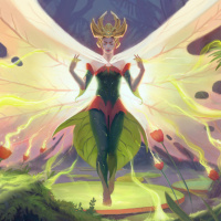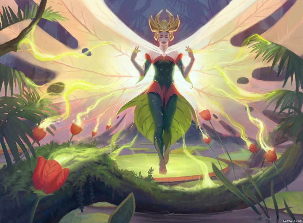 butterfly wings and is surrounded by magical elements such as flowers, vines, and glowing particles that suggest the presence of magic or enchantment. The setting appears to be a lush, forest-like environment, and the overall impression is one of beauty and otherworldliness, typical of
