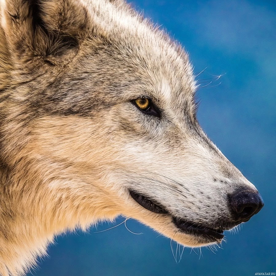 На картинке изображена голова волка на фоне голубого неба. Волк обладает бдительным и сосредоточенным выражением, его глаза смотрят прямо вперед, возможно, к чему-то или кому-то вне кадра.