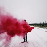 red smoke or powder, which he has spilled onto the ground in front of him. The figure stands prominently in the middle of the frame, wearing