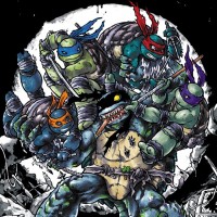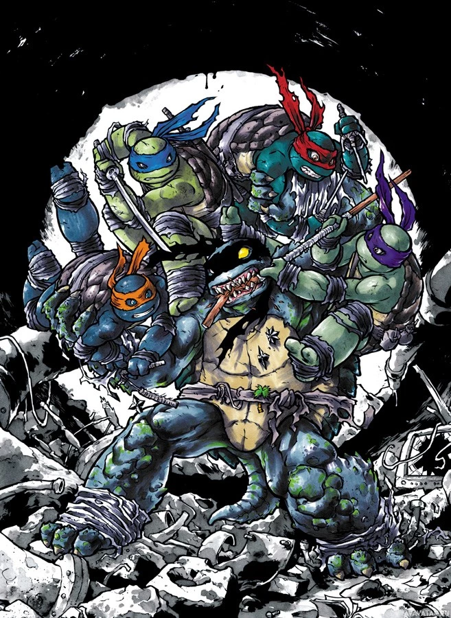 The image features a black and white illustration of four Teenage Mutant