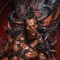 sharp teeth, and horns, which are common features for demons in various mythologies and fantasy genres. The character is wearing armor or clothing made of