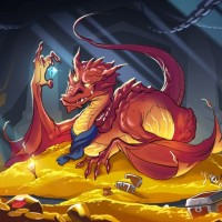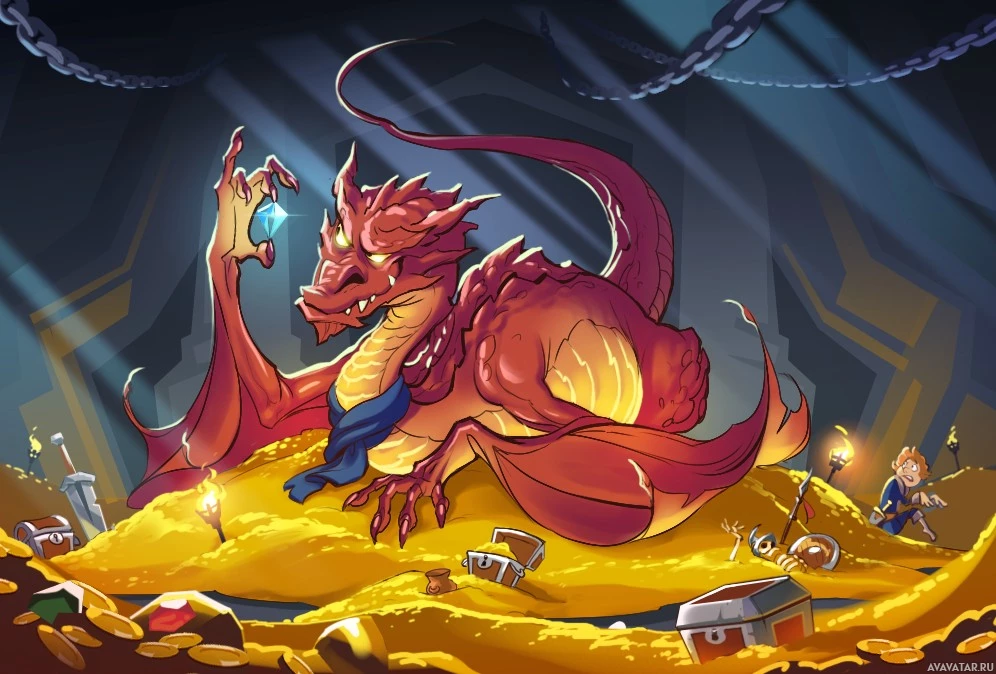 mythological worlds. The dragon appears to be Smaug from "The Hobbit" series, known for its affinity for gold and treasure. The scene is dramatic with