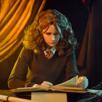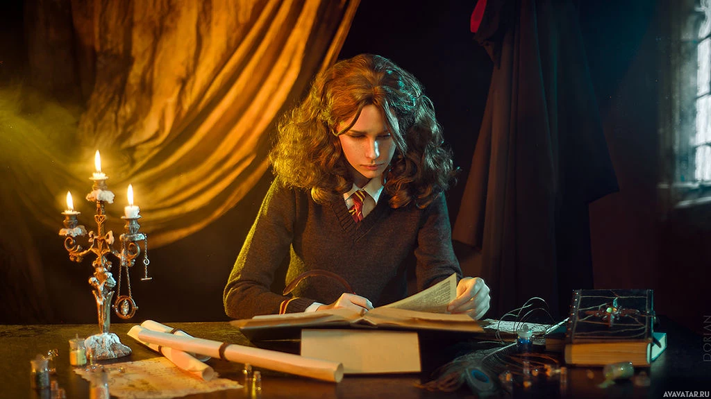 The image shows a person dressed in a costume that appears to be inspired by the character of Hermione Granger from