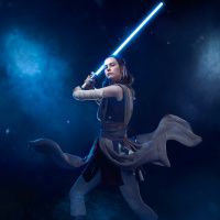 a brown jacket and holding a lightsaber. This character has become well-known for her role in the Star