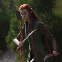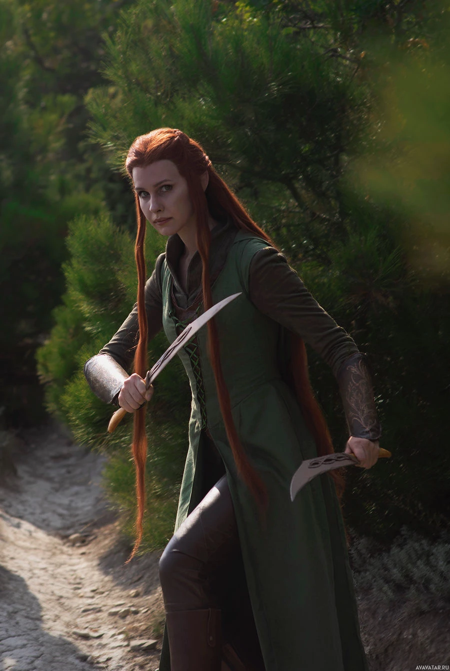 The image shows a person dressed as Tauriel, a character from the "Middle-earth" series. The cosplay includes a green outfit with