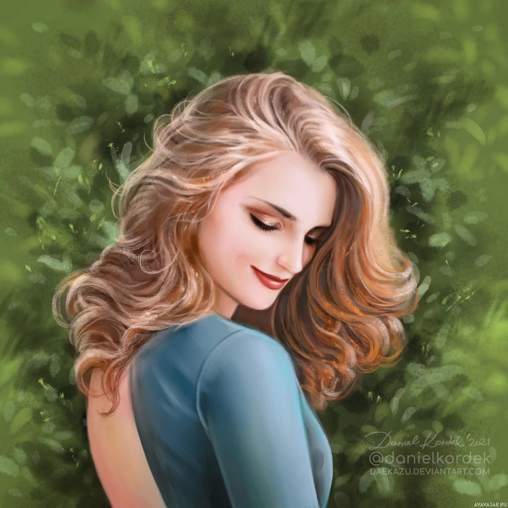 blonde hair and is wearing a blue garment, possibly a dress or top. The background consists of greenery, indicating that the scene could be outdoors, perhaps in a park or garden setting. The artwork captures a serene and introspective mood.