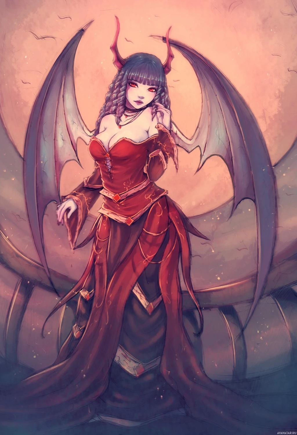 The image depicts a character with demonic features, often associated with fantasy or