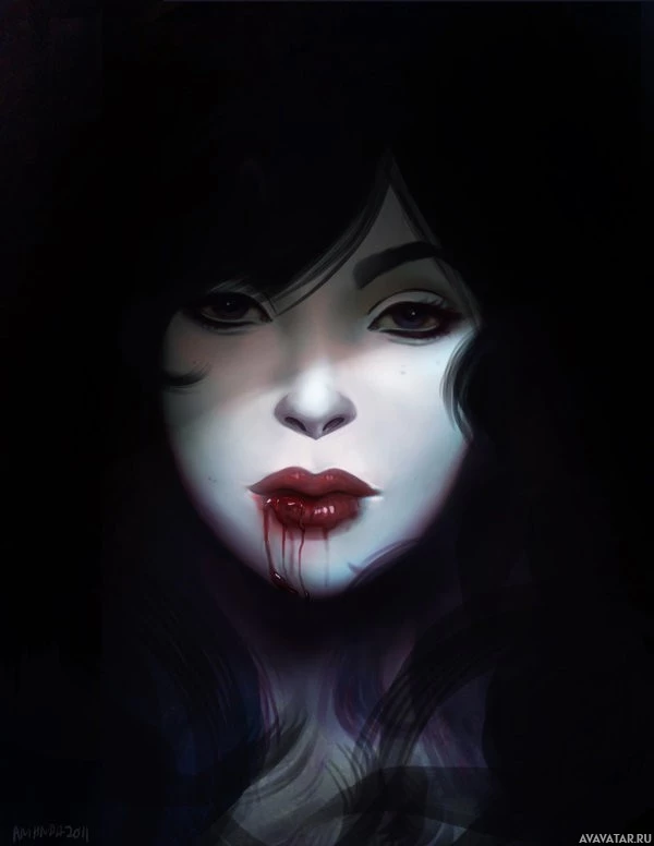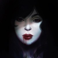 red lipstick and her eyes are glowing, which adds to the fantastical nature of the artwork. The background is dark, highlighting her as the central figure. There's an eerie ambiance to the picture that is consistent with the typical aesthetic associated with vampires in folklore and