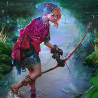 The image depicts an elf character, dressed in fantasy attire and wielding a bow. The setting appears to be a swampy or marshy environment, with water around the feet of the character, suggesting she is either stepping out of or wading through the water. The artwork has a whimsical and imaginative quality typical of fantasy genres.