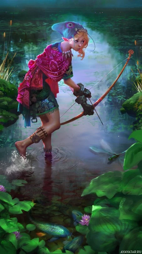 На картинке изображен эльфийский персонаж, одетый в фантастическую одежду и имеющий лук. Сцена кажется болотистой или болотистой средой, с водой вокруг ног персонажа, предполагая, что она либо выходит из воды, либо пробирается через нее. Произведение искусства имеет причудливое и образное качество, типичное для жанров фэнтези.