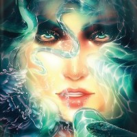 a serene expression on her face and is looking slightly to the side. There are various elements around her that seem to be oceanic or underwater in nature, such as bubbles and possibly seaweed or other