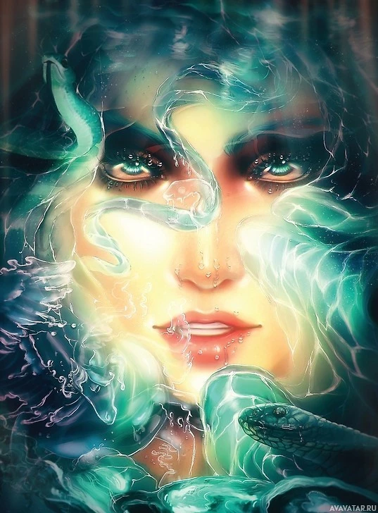 The image shows a fantasy-themed artwork of a girl with water-like features. Her hair and skin have shades of blue, suggesting an aquatic theme. She has