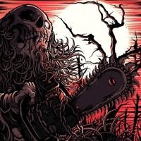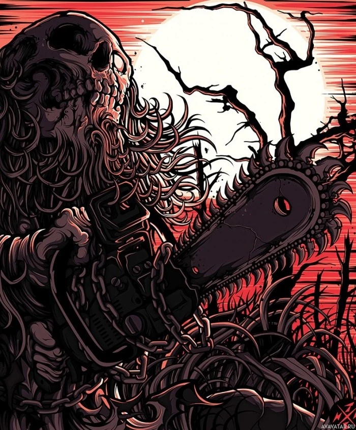 flowing hair holding a chainsaw and standing next to what looks like a decayed tree with jagged branches under a red moonlit sky. The overall atmosphere of the image suggests a theme related to horror or macabre themes.