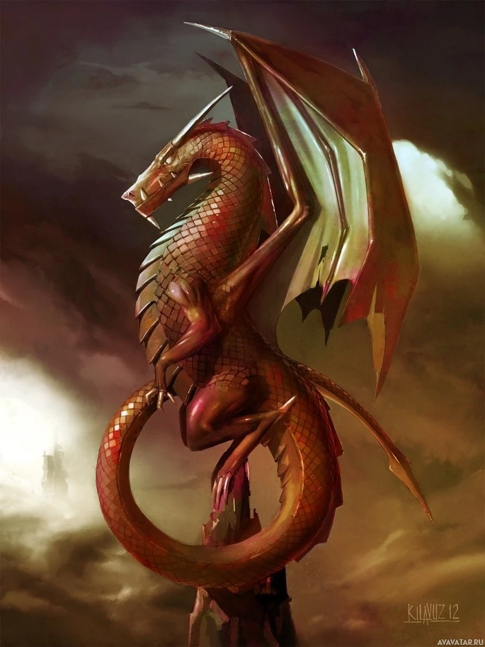 shades of red and green, giving it an imposing appearance. In the background, there appears to be a castle or fortress with mist or smoke rising from it, suggesting a mystical or eerie atmosphere. The style of the image is illustrative, possibly drawn or painted with attention to detail that would appeal to fans of