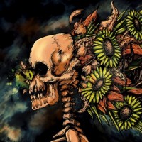 yellow flowers and green foliage sprouting from it. The background has a darker tone, possibly representing dirt or decay, which contrasts with
