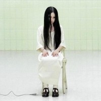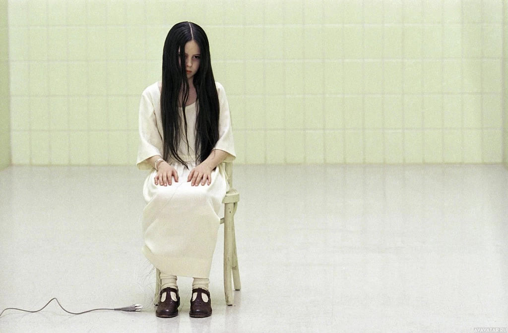 long hair and is wearing a light-colored gown that might suggest some sort of medical or psychiatric facility. Their posture seems contemplative or perhaps even distressed, given the context of the scene. The setting evokes the atmosphere from movies or series known for their psychological horror elements.