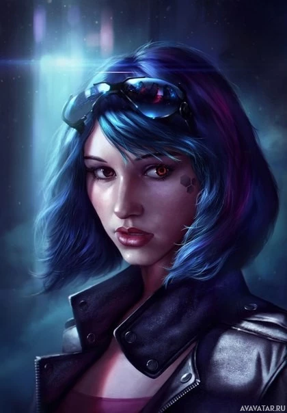 blue hair, wearing sunglasses. She has a bold and striking appearance, suggesting she might be a part of a narrative or concept related to cyberpunk or science fiction themes. The background is dark and moody, which complements her
