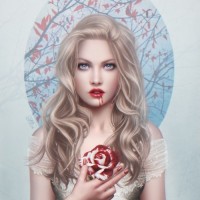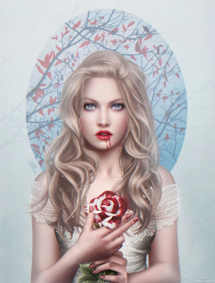 red lipstick on, which adds a touch of color to her appearance. Her eyes are blue, and she is looking directly at the viewer. The style of the artwork suggests it could be related to fantasy or romantic themes. In her hands, she holds