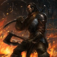 The image depicts a warrior standing amidst fiery destruction. He is holding an axe and appears to be in a battle stance, possibly emerging from the flames or preparing to fight within them. His attire suggests he may be from a medieval or fantasy setting. The presence of fire and destruction around him indicates a scene of conflict or adventure.