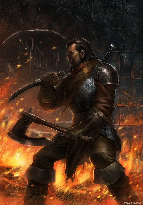 Картинка показывает воина, стоящего среди огненного разрушения. Он держит топор и, кажется, находится в боевой позиции, возможно, выходя из пламени или готовясь сражаться внутри них. Его одежда предполагает, что он может быть из средневековой или фэнтезийной обстановки. Наличие огня и разрушения вокруг него указывает на сцену конфликта или приключения.