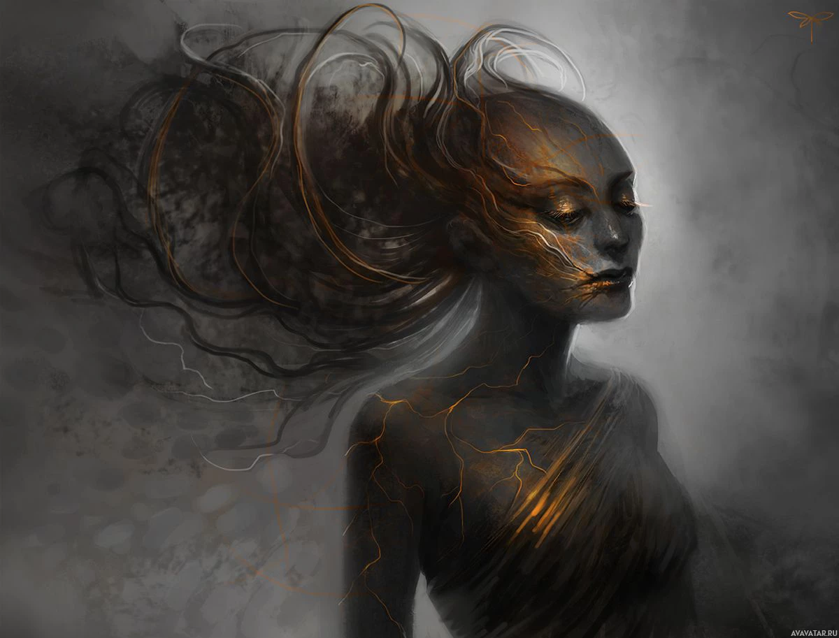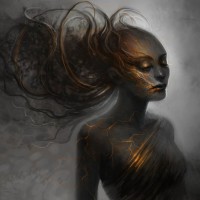 dark hair that cascades down her shoulders. Her complexion is pale, which contributes to the fantastical quality of the image. There are elements within the artwork suggesting digital manipulation or artistic creativity; there are sparks or golden motes that seem to fly around her face and body, adding a sense of