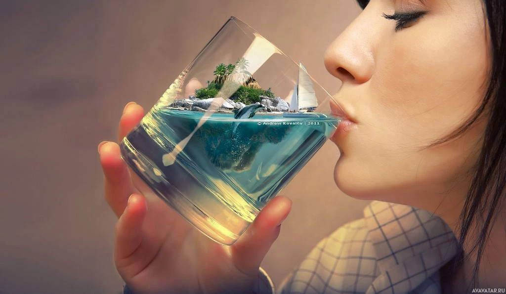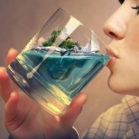 a clear glass. The liquid in the glass has an island or paradise scene inside of it, with elements like