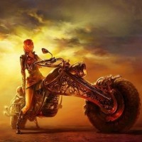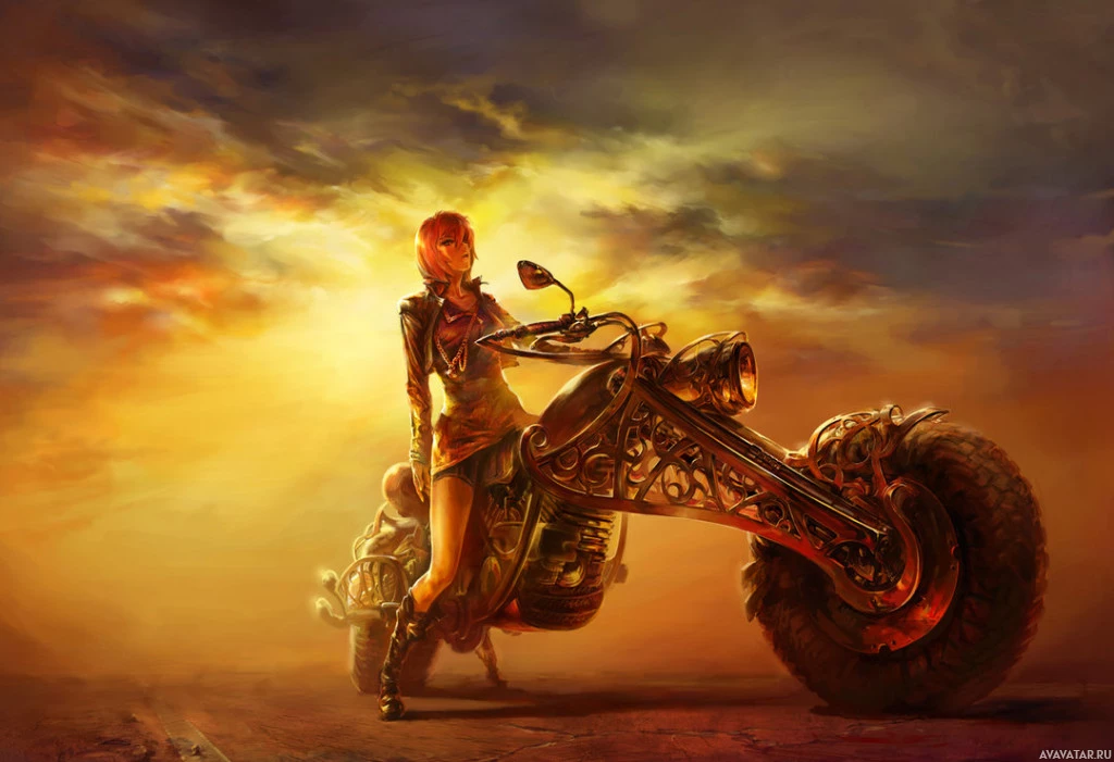 a female character with red hair, riding a motorcycle. There is also another