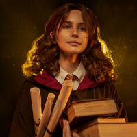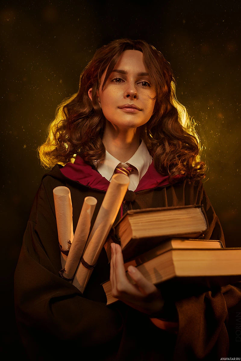 The image depicts a person dressed in a costume, representing the character of Hermione Granger from the "