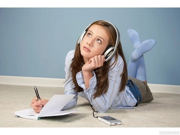 a young woman lying on her stomach with her head supported by her hands. She is wearing headphones and has one foot crossed over the other. In front of her, she appears to be writing or drawing on some paper that's spread out on the floor. Her expression seems focused or deep in thought, as if she is trying to solve a problem or concentrating on her work. There are also books and what looks like a pen nearby, suggesting she might be studying or working on something. The setting appears to be