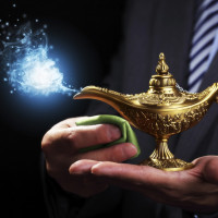 a professional setting, possibly an office or boardroom. The lamp is traditionally associated with stories where a genie resides within it and grants wishes to the person holding it. In this image, there is also a magical