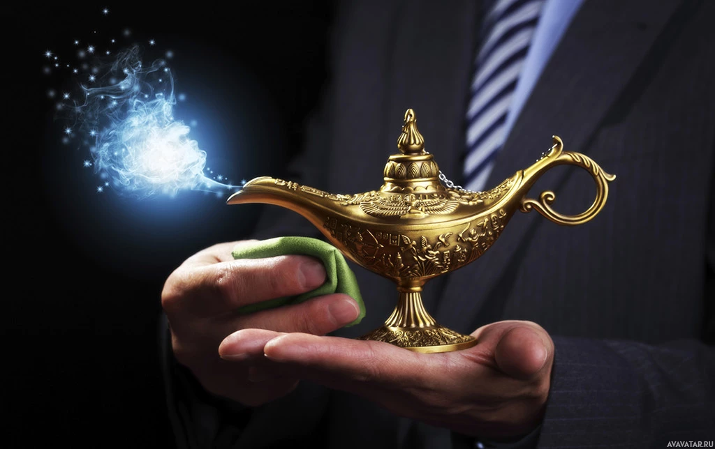 a golden lamp, which is known as a magic lantern or genie's lamp. The lamp is being held in front of a person wearing a suit, suggesting