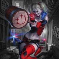 iconic attire with red and black colors, complete with her signature baseball bat. Her appearance is dynamic, suggesting motion, possibly during a fight or