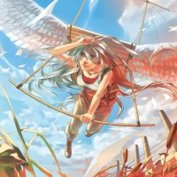 a dynamic pose that suggests movement, possibly flying or jumping. Her clothing and wings give her the appearance of