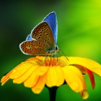 На картинке изображена маленькая синяя бабочка, сидящая на цветке. Есть также желтый цветок с зелеными листьями на заднем плане, что говорит о том, что эта сцена находится на открытом воздухе в естественной среде, где можно найти такую флору и фауну.