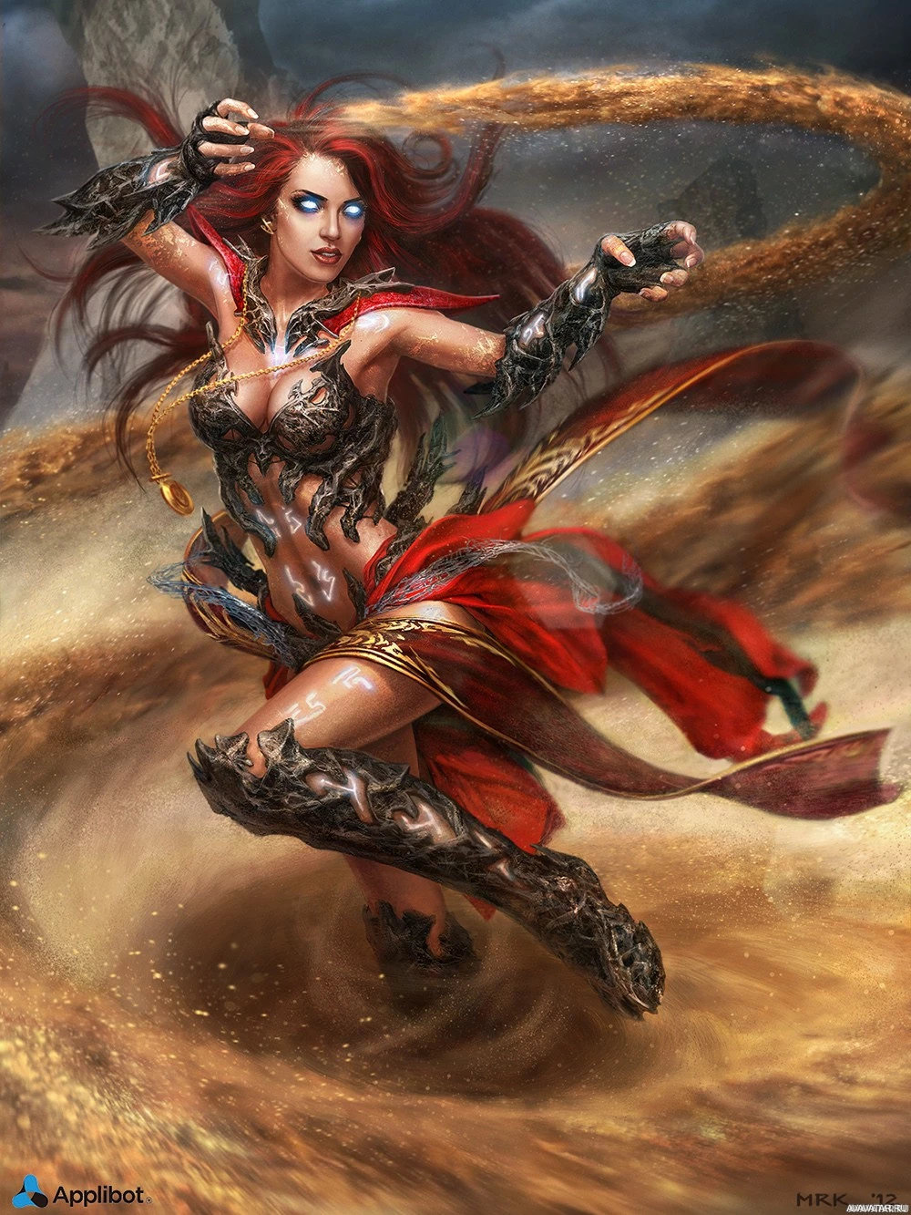an action pose, suggesting movement or combat. The fantasy elements such as the armor and the magical-looking aura around her suggest that she might be a warrior or a heroine from