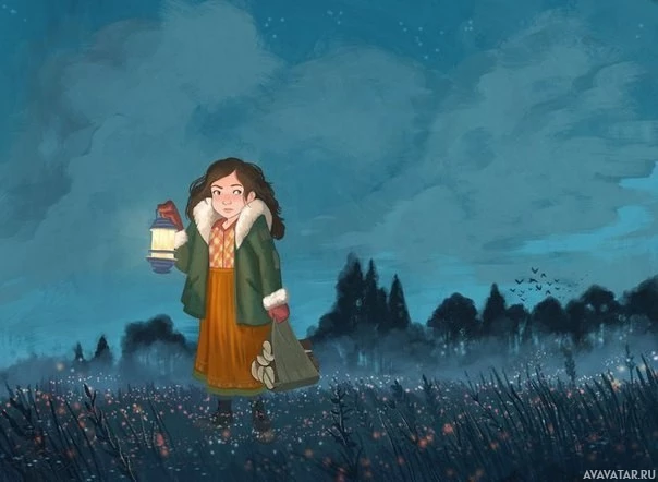 an open field during nighttime. She appears to be observing something attentively with a lantern in her hand, which she seems to be using as