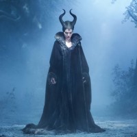 The image features a character known as Maleficent, portrayed by Angelina Jolie. She is standing in a forest at night with mist and trees around her. Maleficent is wearing a dark costume with horns on her head and has a serious expression on her face. This character is from the movie "Maleficent," which is based on the fairy tale of Sleeping Beauty.
