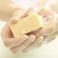 The image shows a hand holding a bar of soap and washing it under water. The soap has suds or bubbles on it, indicating that it is being used for washing purposes. There's also a blurred background suggesting the setting may be a bathroom or similar space with a sink or basin.