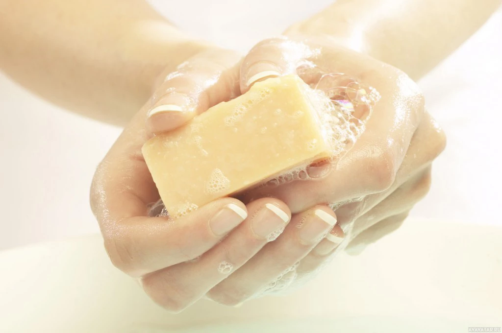 На снимке изображена рука, держащая брусок мыла и умывающая его под водой. На мыле есть швы или пузырьки, что указывает на то, что оно используется для мытья. Существует также размытый фон, предполагающий, что обстановка может быть ванной комнатой или аналогичным пространством с раковиной или бассейном.