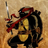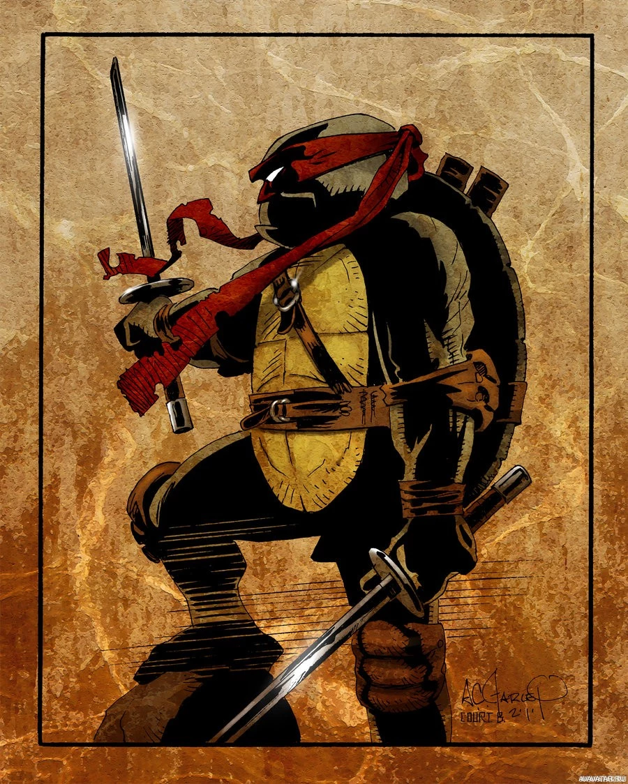 The image depicts an illustration of a character known as Raphael from the Teenage