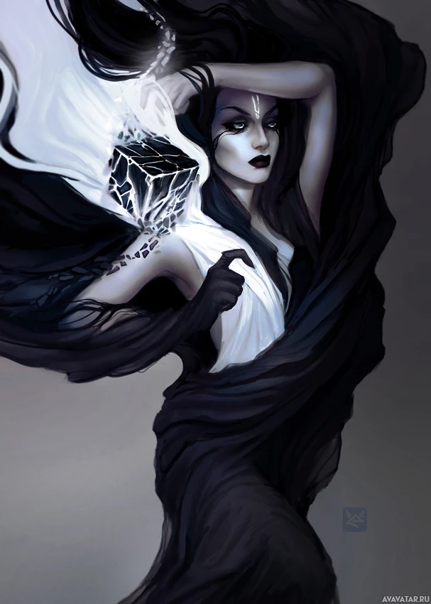 black attire, possibly including a dress or cape. There is an object floating above her hand that appears to be a shattered gem or crystal. Her expression seems contemplative, and she is holding her hands out towards the crystal. The background is monochromatic, consisting of