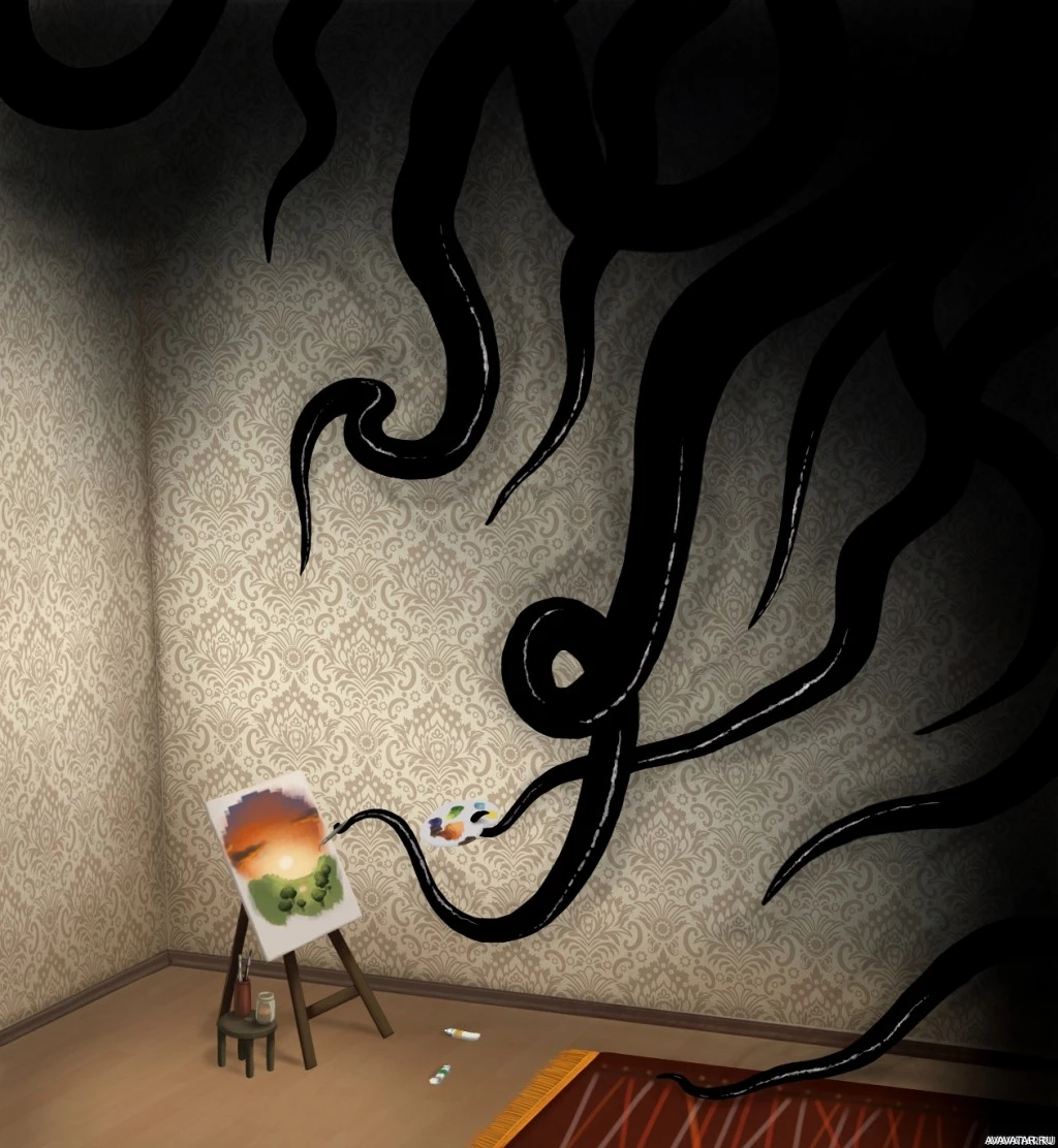 a dark room with a painting hanging on the wall. The monster, which is represented by long, twisting tentacles or strands that resemble black snakes, has emerged from behind the canvas and is reaching out towards it. This creates