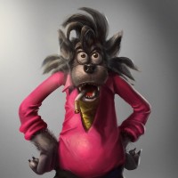 The image features a stylized animated character that appears to be a wolf. This character is anthropomorphic, meaning it has human characteristics such as the ability to stand upright and wear clothing. The character is wearing a pink shirt and seems to have a surprised or startled expression on its face. It's standing against a neutral background.