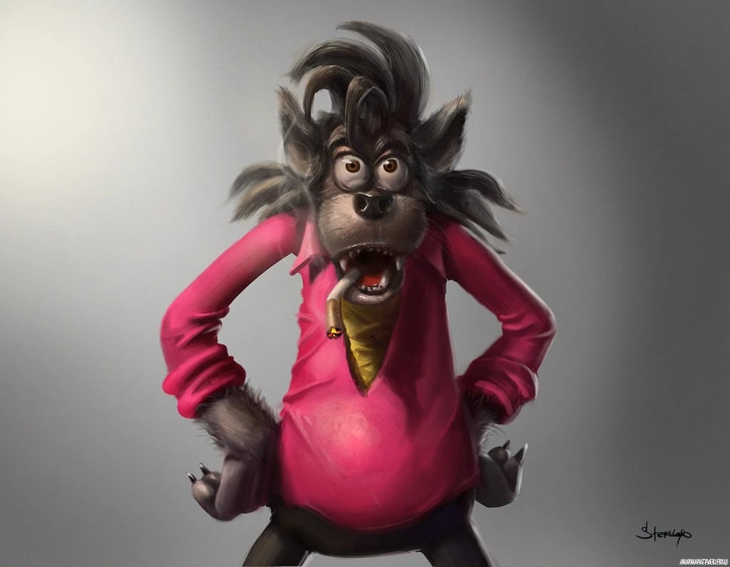 На картинке изображен стилизованный анимированный персонаж, который выглядит как волк. Этот персонаж антропоморфный, что означает, что он имеет человеческие характеристики, такие как способность стоять прямо и носить одежду. Персонаж носит розовую рубашку и, кажется, удивлен или поражен выражением лица. Он стоит на нейтральном фоне.