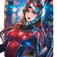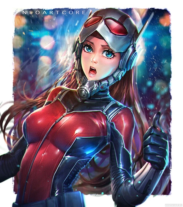 superhero form, wearing a suit with red and black colors, complete with a helmet and goggles over her eyes. She has a surprised or excited expression on her face, as if she's in the middle of an adventure or