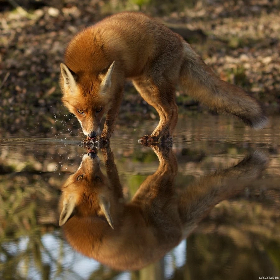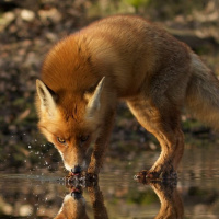 a red fox standing at the edge of a body of water, which could be a pond or river. The fox appears to be looking down into the water and is in the process of drinking or investigating something near the surface. The fox's reflection can be seen on the water, creating an interesting