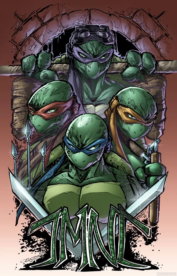 The image features four anthropomorphic turtles, known as the Teenage Mutant